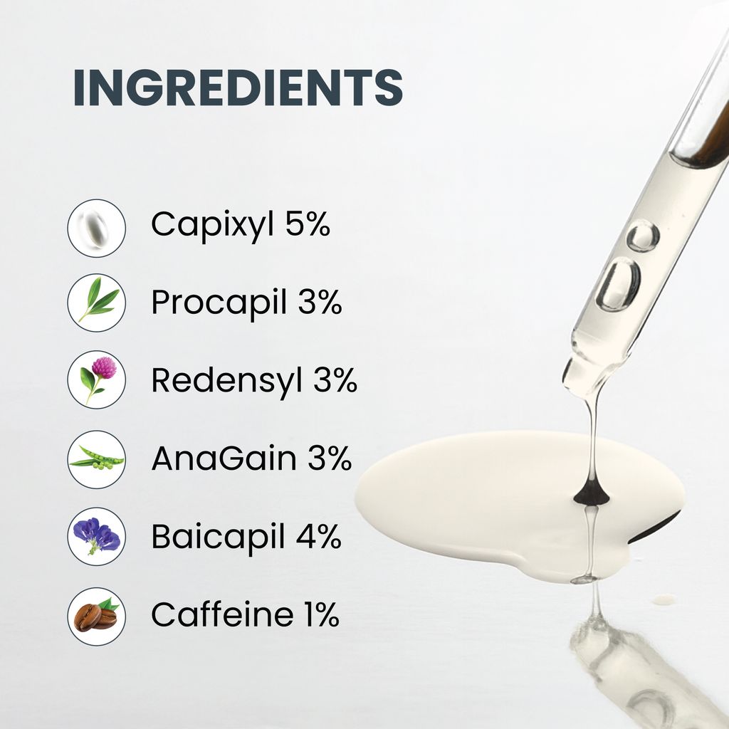 Capixyl (5%): A biomimetic peptide combined with red clover extract, Capixyl helps to inhibit DHT (the hormone largely responsible for androgenetic alopecia) and reduce inflammation in the scalp. It strengthens hair anchorage and improves follicle vitality.