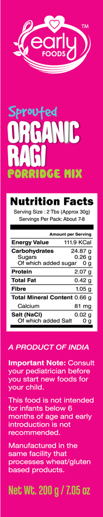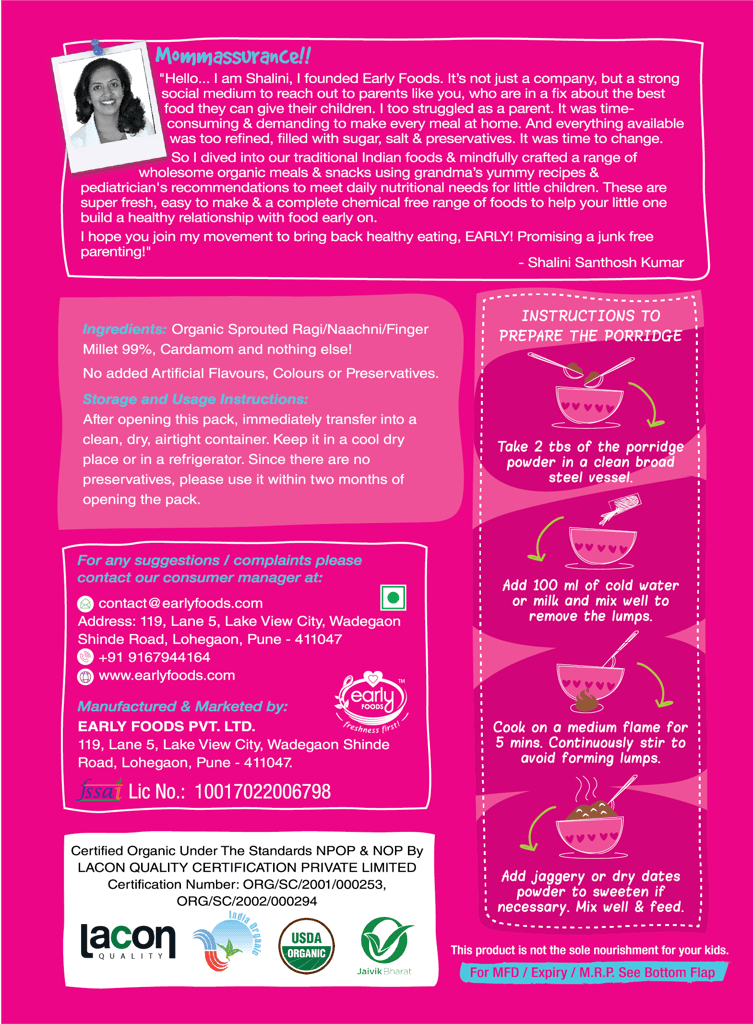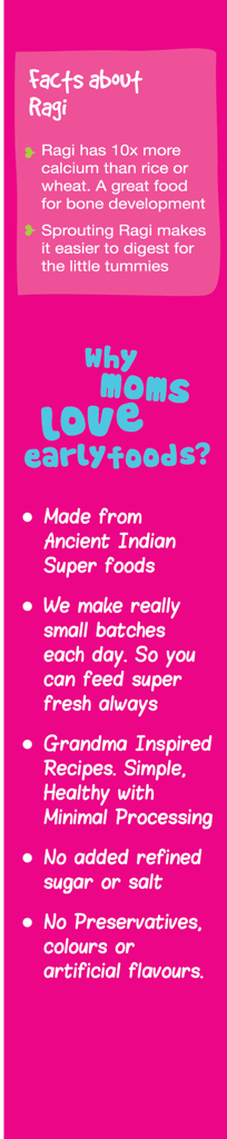 • Ingredients include, Organic Sprouted Ragi, Cardamom/Elaichi and Dates