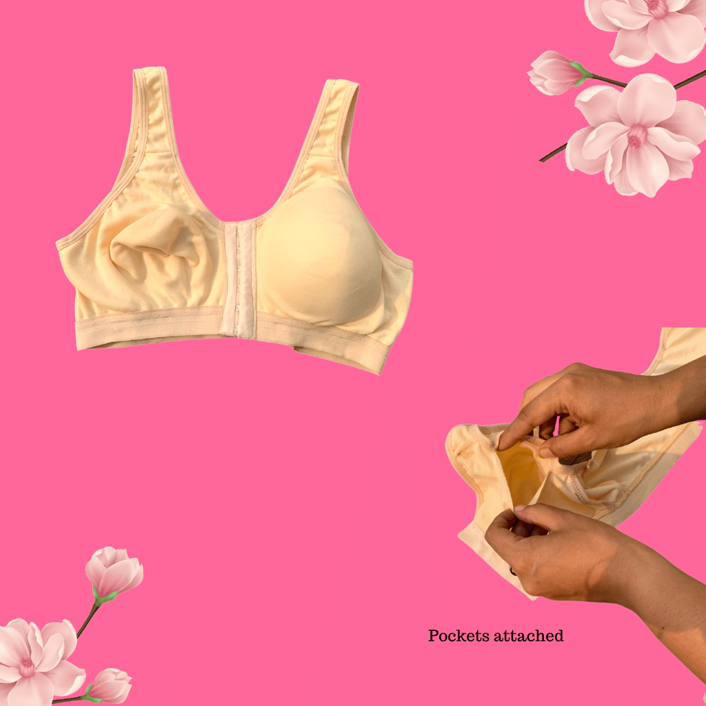 This surgical bra comes with integrated pockets to hold a prosthesis securely, making it a reliable post surgery bra for breast cancer survivors. Made from soft cotton-blended hosiery fabric, this seamless bra ensures a smooth fit and a natural silhouette.