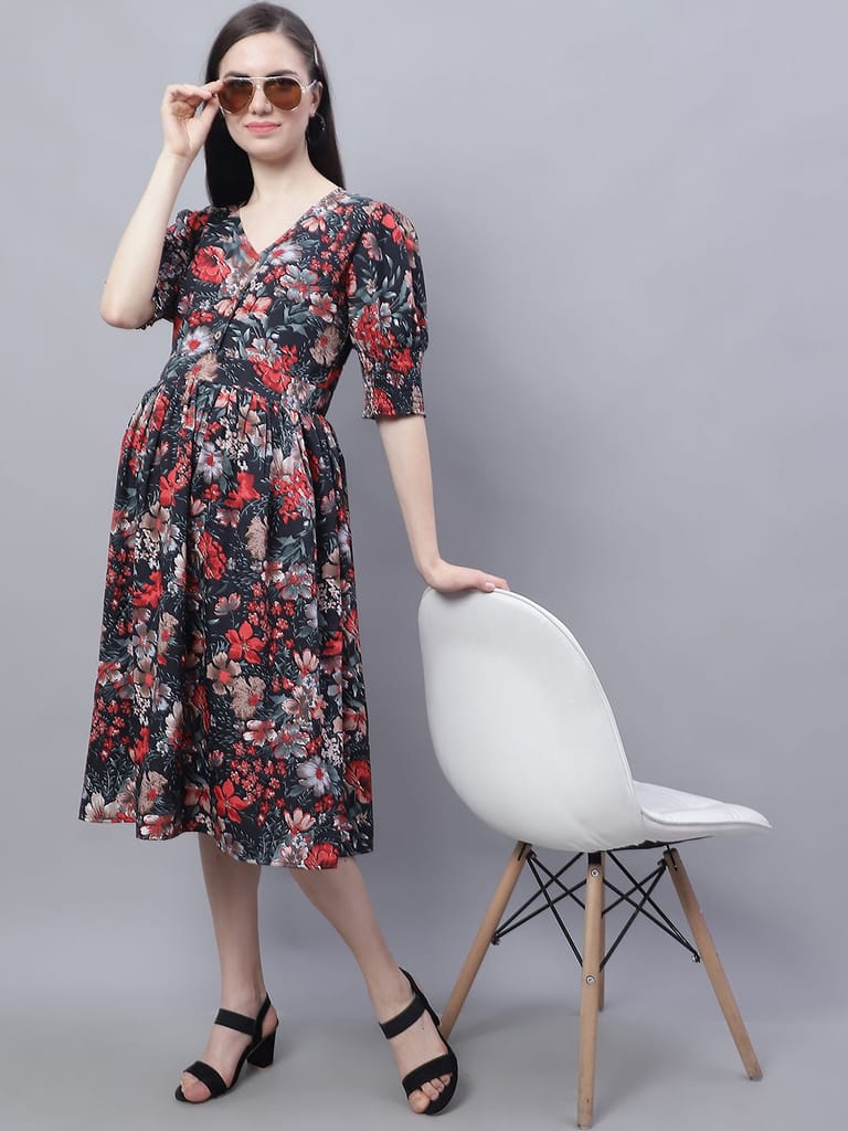- It comes with elasticated waist, has Round Neck & Half Smoking Sleevess. Floral Print on Black & Red Color Maternity Dress, Front Buttons for nursing post pregnancy.