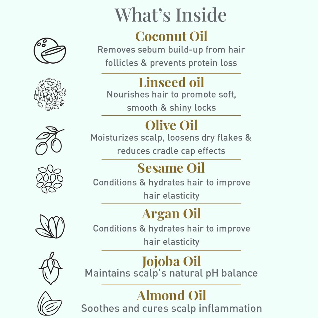 • Blend of 7 natural seed oils that gently care for and nourish baby's delicate locks & scalp