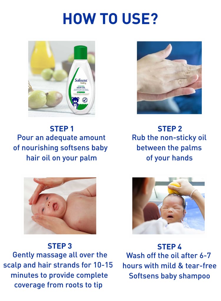 • Gently massage over your baby's scalp and spread evenly to loosen dry skin and promote hair growth