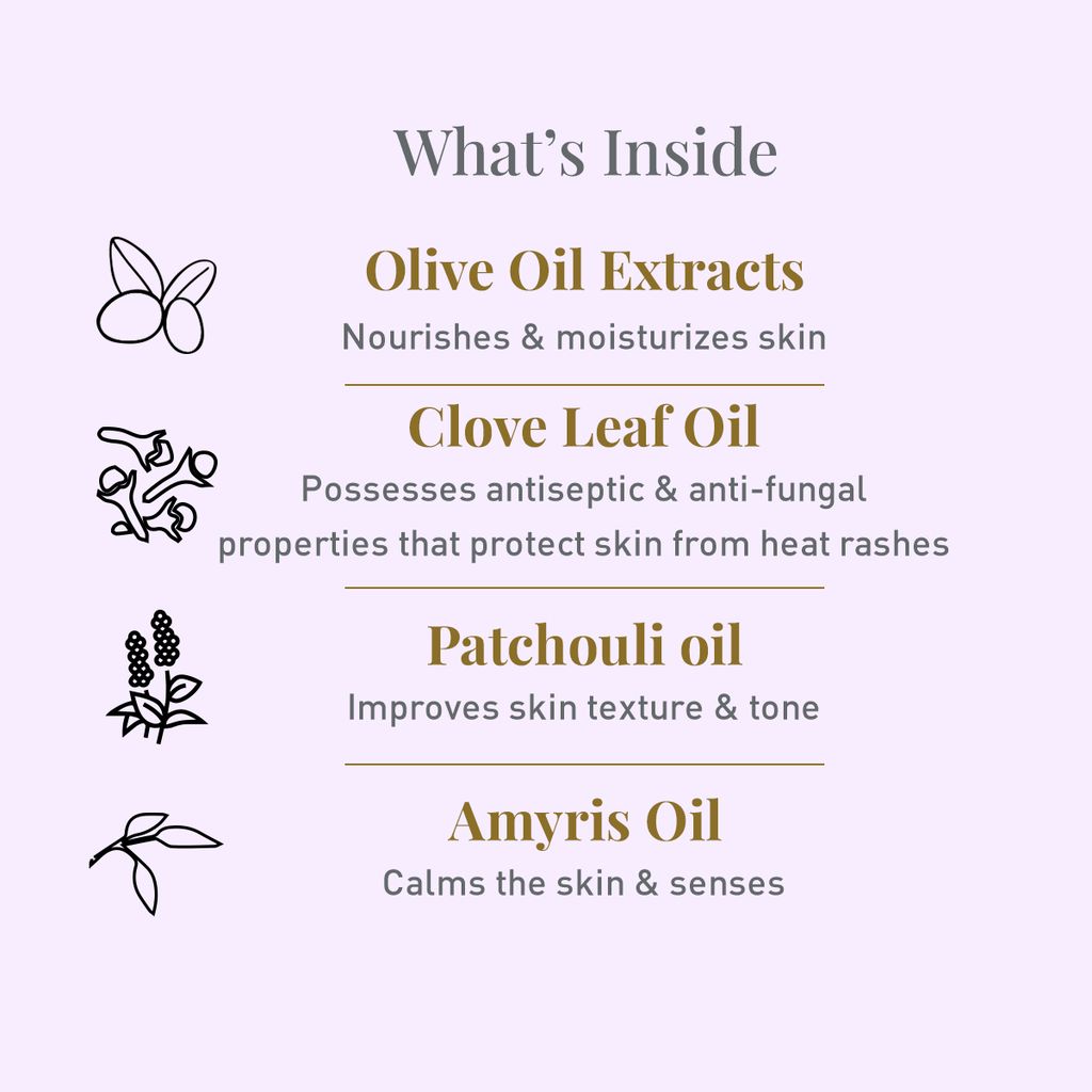 Softsens Baby Powder is formulated with these natural ingredients: - Olive oil, to help nourish and moisturize skin. - Clove leaf oil, with antiseptic and antifungal properties to protect skin - Patchouli oil, to soothes and protect irritated skin - Amyris oil, to calm the skin and senses.