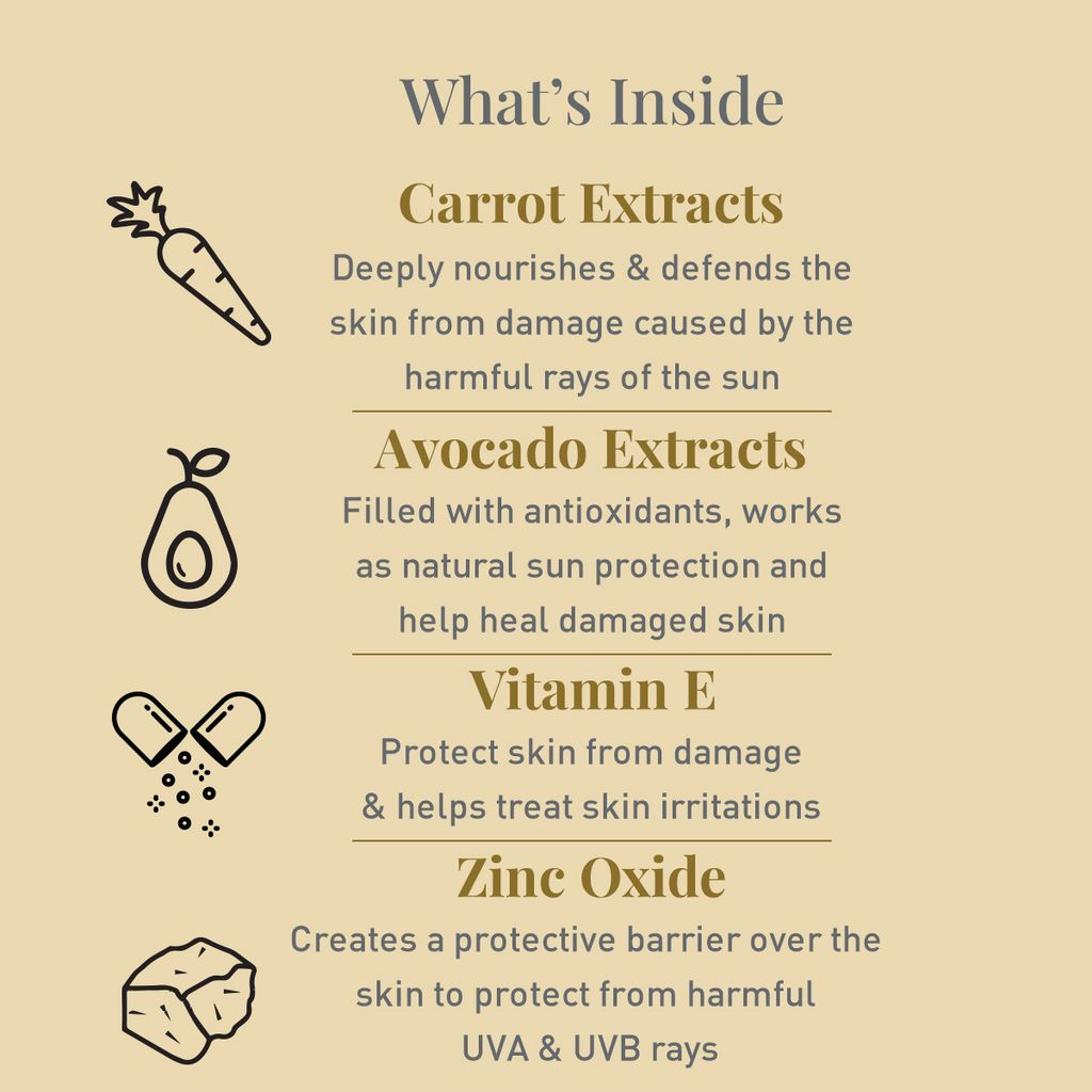 This sunblock lotion is especially formulated with the safest and mildest ingredients, to make sure that it can be used on both adults and babies, including newborns. It is enriched with Vitamin E, avocado and carrot extracts to protect and moisturize skin, and powerful Zinc Oxide that acts as a protective barrier between skin and the sun's rays. It is also hypoallergenic and tested by world-class experts for safety.