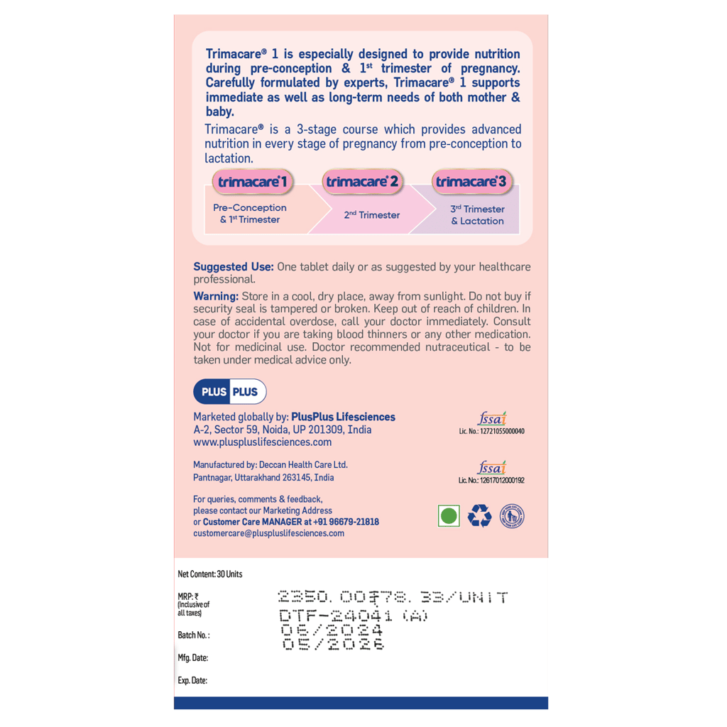 Plus Plus Trimacare 1- 20+ Prenatal Multivitamins for Pregnancy (1 - 12 Weeks)