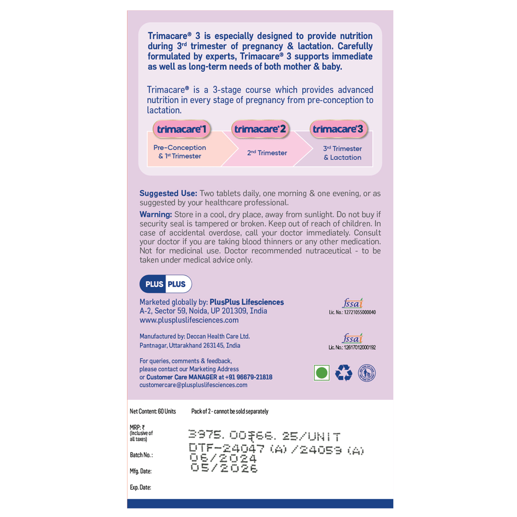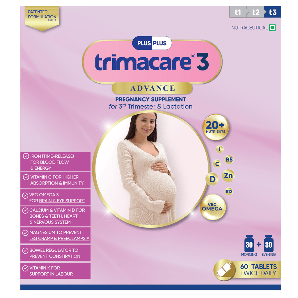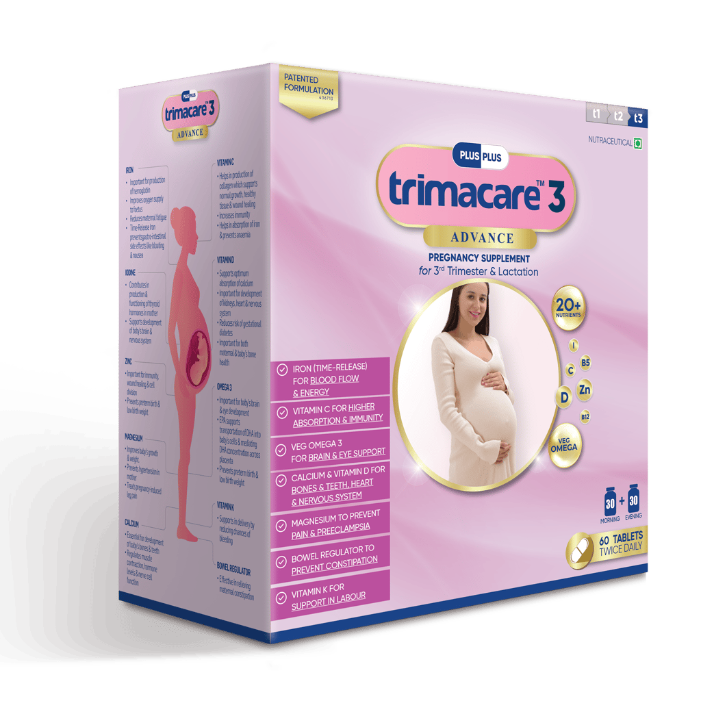 Plus Plus Trimacare 3 - 20+ Prenatal Vitamins - Veg Omega, for Baby's RBC, Blood, Brain, Eye (27 - 40 Weeks)
