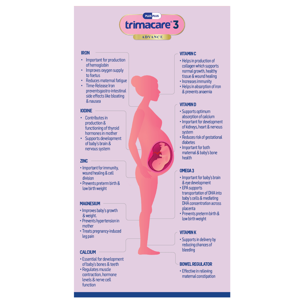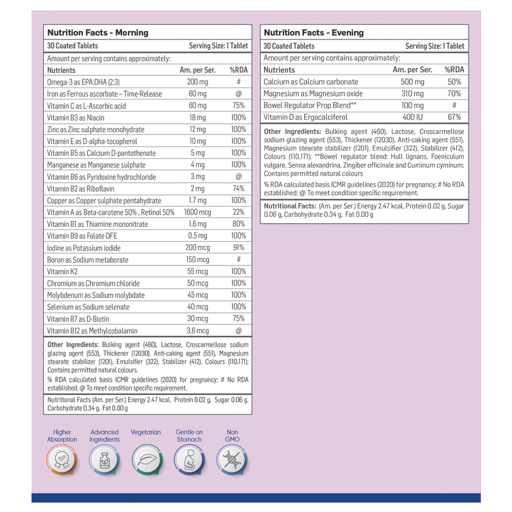 Contains 20+ essential nutrients recommended during the 3rd trimester of pregnancy. As the body prepares for delivery, it requires Iron, Calcium, Zinc, Vitamin D and more. Magnesium supports maternal wellbeing; Vitamin K helps during delivery & Omega-3 (Vegetarian, derived from deep-sea Algae) continues support in brain development.