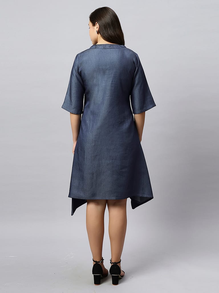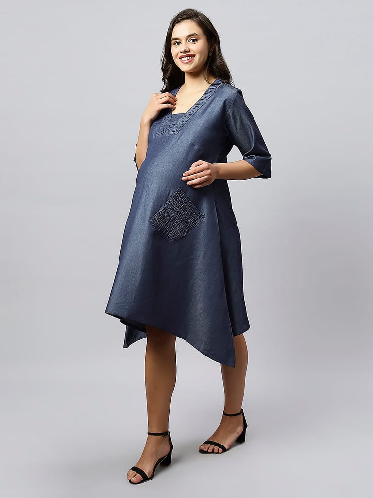 - Asymmetrical maternity dress with designer front pockets and 3/4th sleeves which features a gathered V neck and comfortable fit, made with denim tencel fabric, this midi style will keep you feeling most comfortable through out all trimester,and also will adjust the fit to your body throughout pregnancy and beyond.