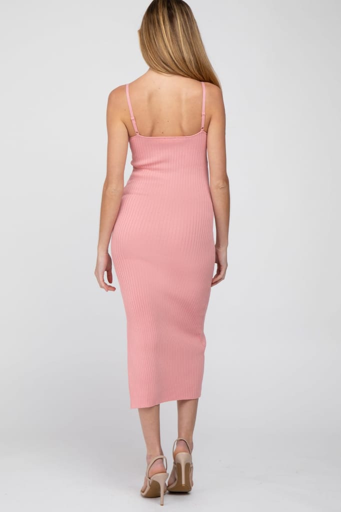 VDRESS Pink Ribbed Square Neck Side Slit Maternity Midi Dress